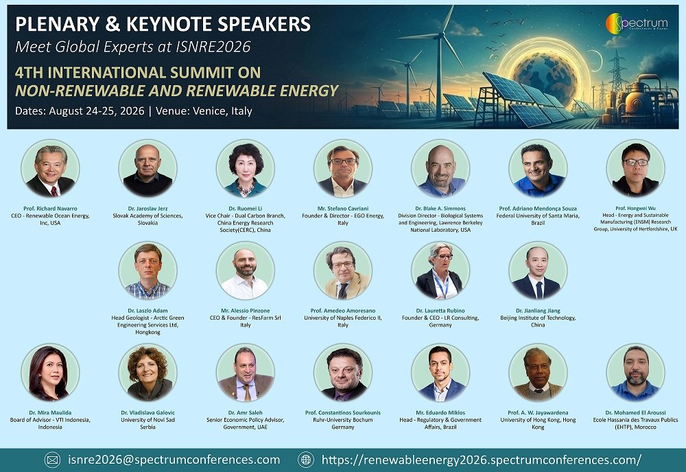 The 4th International Summit on Non-Renewable and Renewable Energy (ISNRE2026) will be held on August 24–25, 2026 in Venice, Italy. This global event brings together leading researchers, industry experts, policymakers, and innovators to discuss advancements in renewable technologies, energy transition strategies, smart grids, storage solutions, and sustainability pathways. ISNRE2026 offers plenary talks, keynote sessions, technical presentations, and exceptional networking opportunities for professionals across the energy sector.